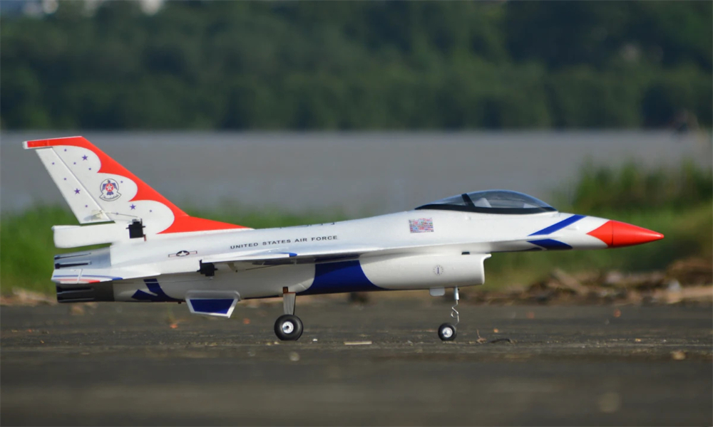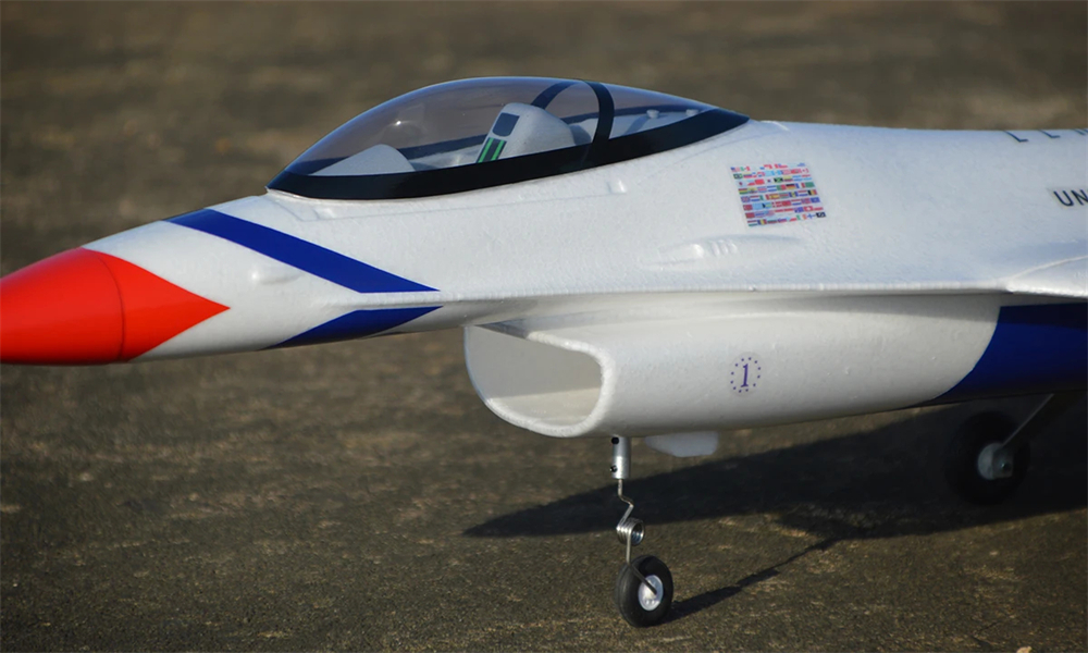 The moment you pull this bird out of the box, you’ll feel it. Built from lightweight EPO foam, the F16 V2 arrives in the iconic Thunderbird colorway, crisp livery, sharp panel lines, and realistic detailing that honestly looks better in person than in photos. At 1050mm long with a 710mm wingspan, it’s got presence. It’s the kind of model you set on your bench and just stare at for a minute before flying.