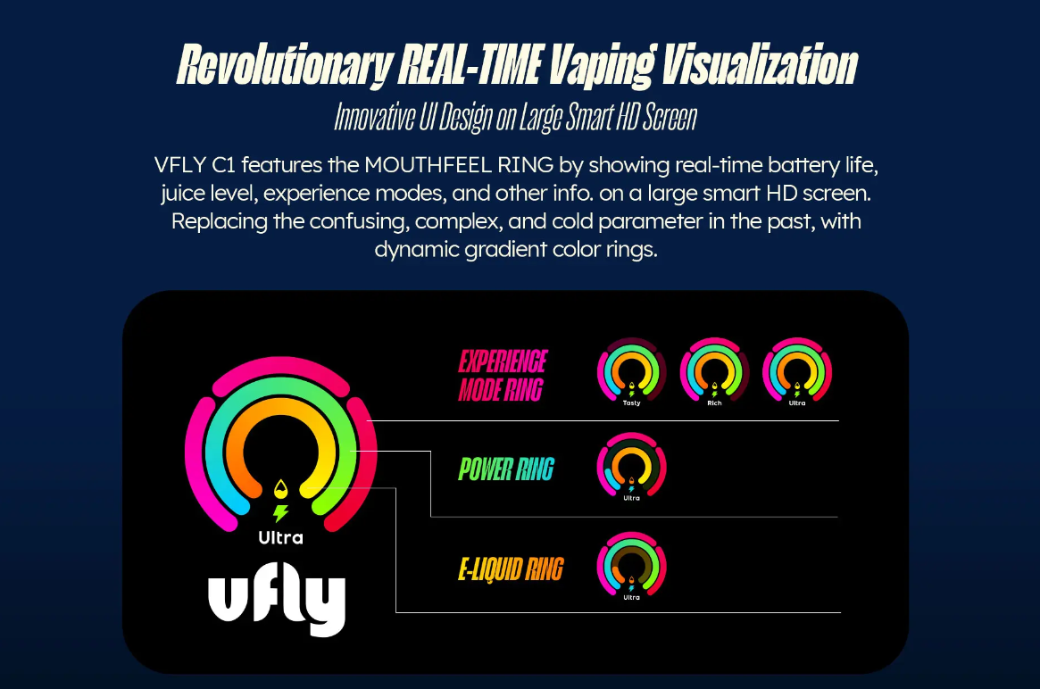 The revolutionary MOUTHFEEL technology is one of the most noticeable aspects of the VFLY C1. As you inhale, the smoothness of the vapor impresses. Thanks to the Dual CRYSTAL MESH Coil, the flavor production is enhanced, ensuring each puff feels rich and flavorful. Whether you’re opting for the Tasty Mode, which maximizes the flavor intensity, or switching between the other modes (Rich and Ultra), the consistency in mouthfeel remains exceptional.