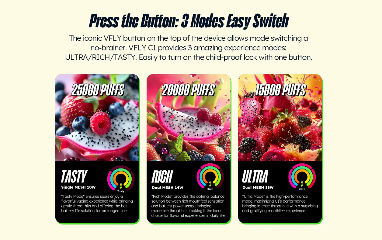 If you’re looking for a long-lasting, flavorful, and reliable disposable vape, the VFLY C1 25000 Puffs is worth considering. Its features cater to both beginners and experienced vapers, and the ability to choose between three output modes ensures a customizable experience.