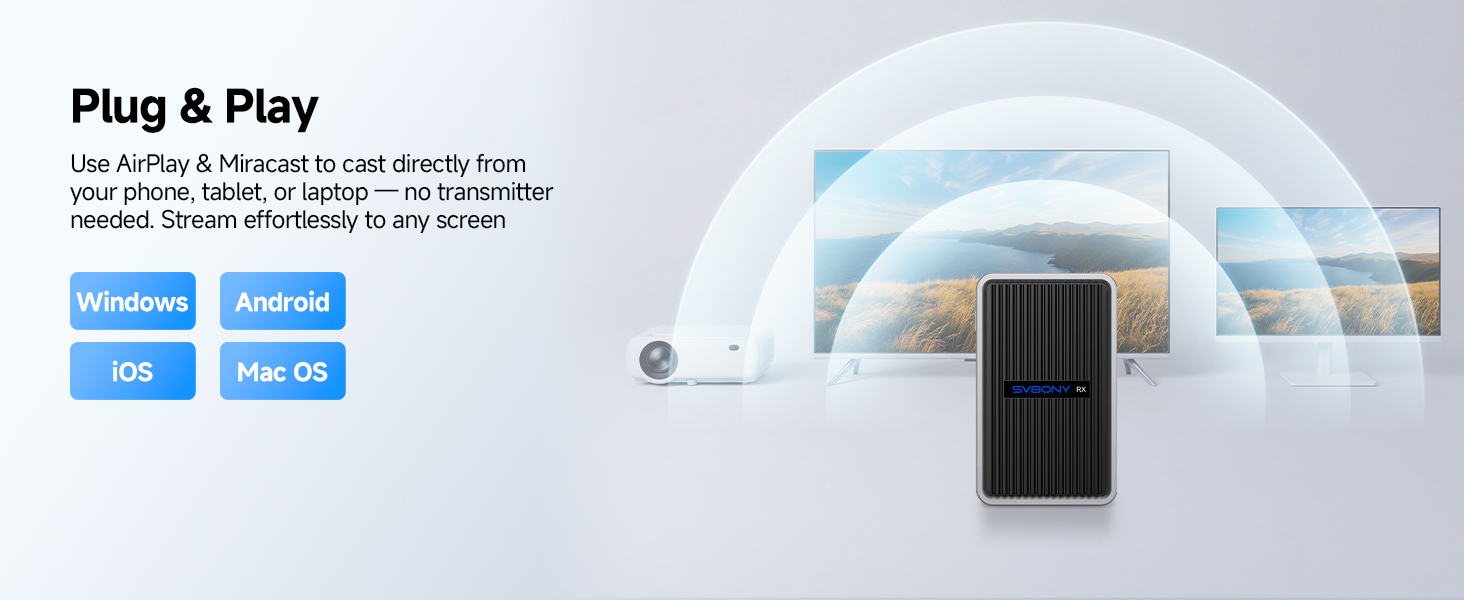 - Wired + wireless dual modes: When directly connected via the transmitter, the signal is more stable with lower latency. The receiver also supports wireless screen casting (AirPlay/Miracast) for flexible switching.