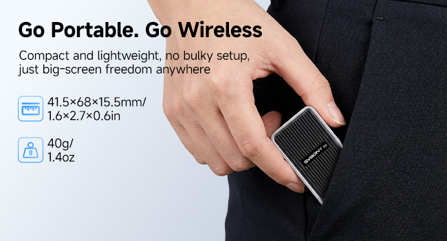 - The transmitter has no built-in battery and relies entirely on the device’s Type-C power. It requires the device to support DP-Alt mode (most modern laptops and flagship phones support this).