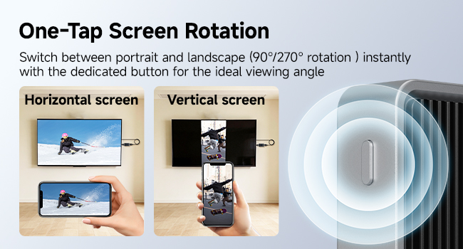 - Easy to use: No need to pair a transmitter; one-click switching between portrait and landscape modes (supports 90°/270° rotation), making it ideal for quick presentations or entertainment.