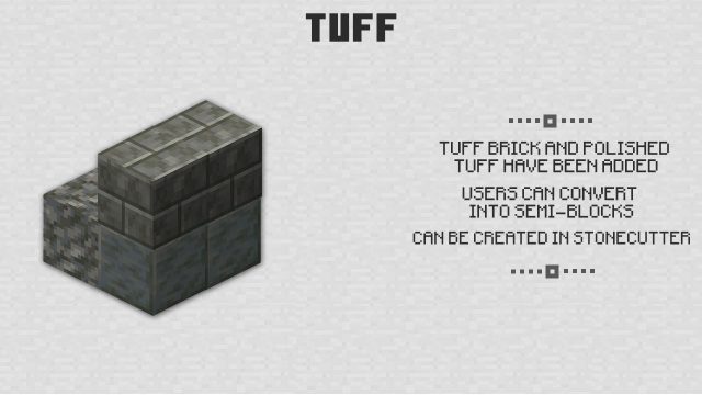 Minecraft version 1.20.60.22 adds more options for tuff blocks, for example, it can be stairs, slabs, walls, and bricks, as well as carved and polished views. Download Minecraft 1.20.60.22 for Android Free here.