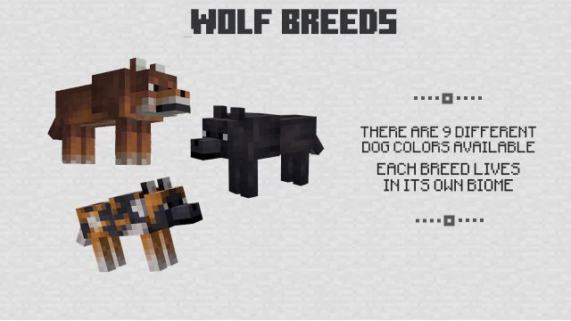 Mojang Studios developers decided to develop the capabilities of pets from wolves. The first stage was the appearance of armor for them, and now a special kind of these animals will spawn in each biome. Traveling through Minecraft 1.20.71, you will be able to meet striped and spotted wolves, as well as other varieties of them: