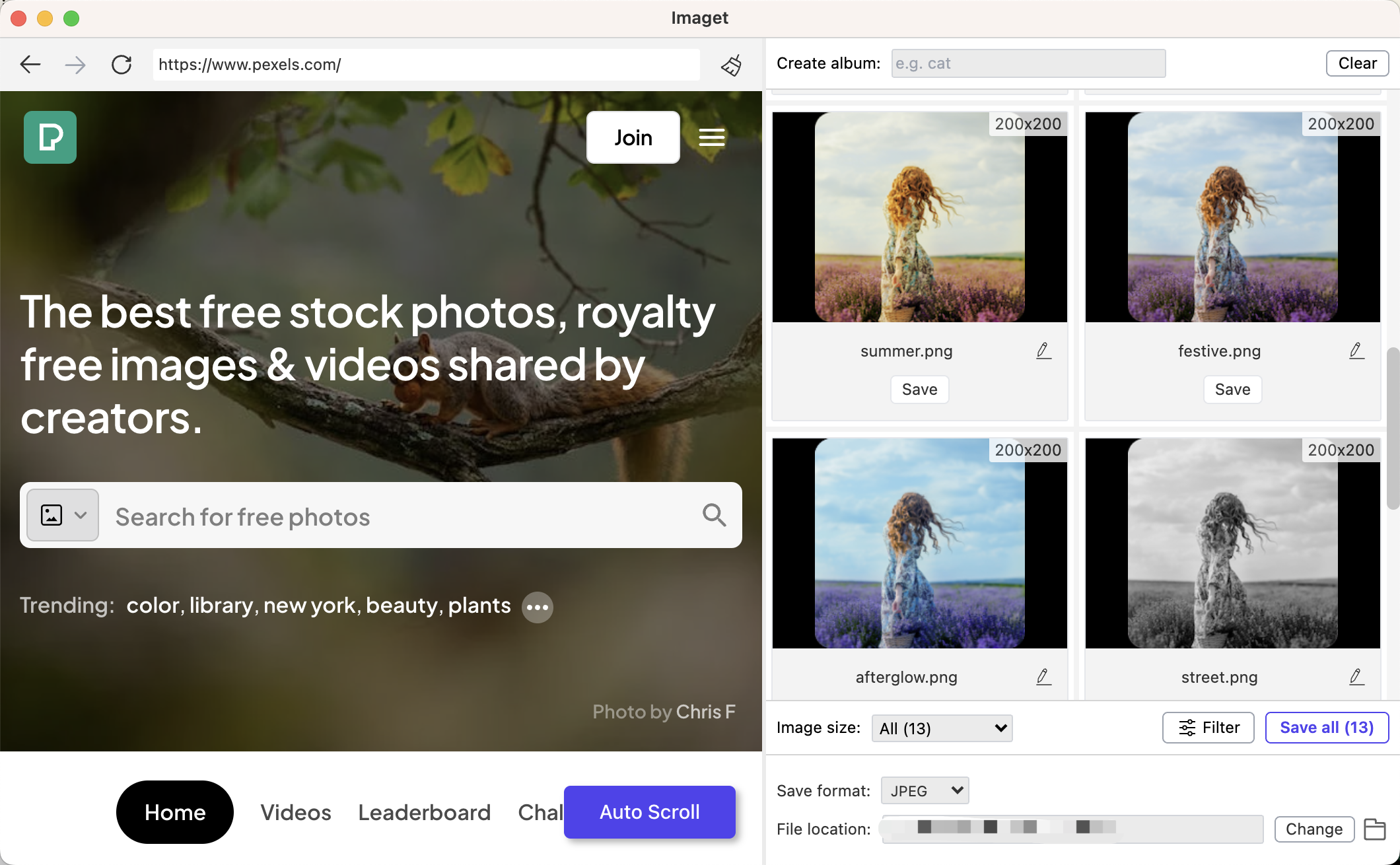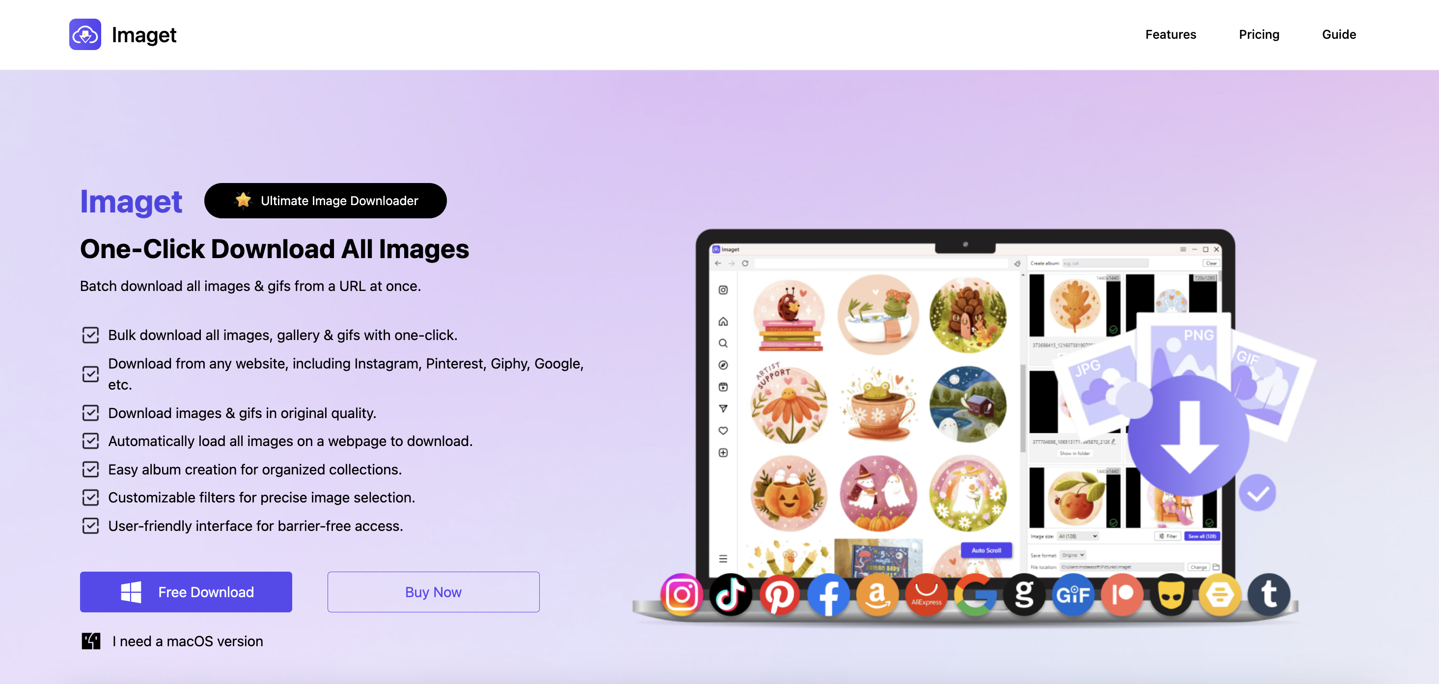 - Supports customizingdownload preferences, including filtering by image size & format, creating albums, renaming images, choose output format and file location.