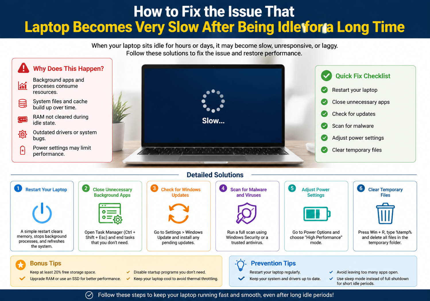 Here are the most effective solutions to fix the issue of a slow laptop after being idle for a long time: