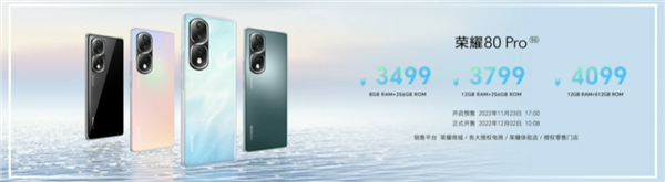 In terms of price, Honor 80 Pro offers three storage versions, 8+256GB for 3,499 yuan; 12+1256GB RMB 3799; 12+512GB, 4099 yuan, will open at 17:00 this afternoon.