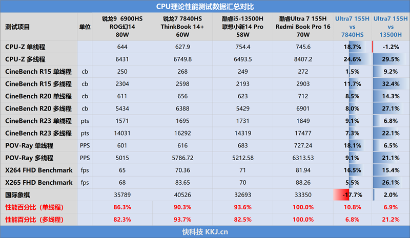 In terms of single-core performance, the Core Ultra 7 155H leads the Ryzen 7 7840HS by 10.8% and shows a 6.9% performance boost over the previous generation Core i5-13500H. Regarding multi-core performance, it maintains its lead, surpassing the Ryzen 7 7840HS by 6.8% and exhibiting a 21.2% improvement compared to the Core i5-13500H.