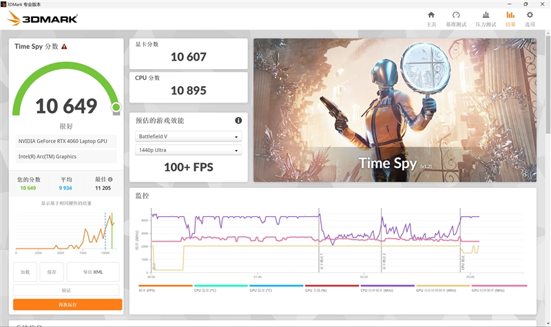 The RTX 4060 Laptop scored a total of 10649 in 3DMark’s Time Spy project, with the GPU graphics score at 10607.