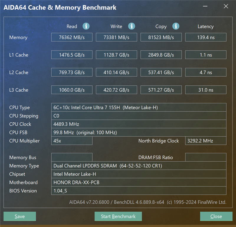 In the CPU-Z benchmark, the Core Ultra 7 155H achieves a single-thread score of 745.6 and a multi-thread score of 8407.2.
