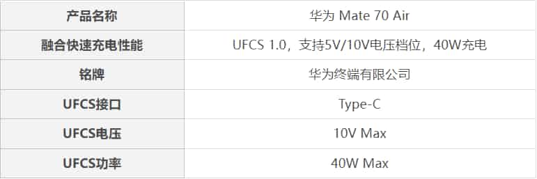 It is introduced that the Huawei Mate 70 Air mobile phone is compatible with the UFCS 1.0 protocol and supports voltage levels of 5V and 10V. The maximum charging power of UFCS can reach 40W.