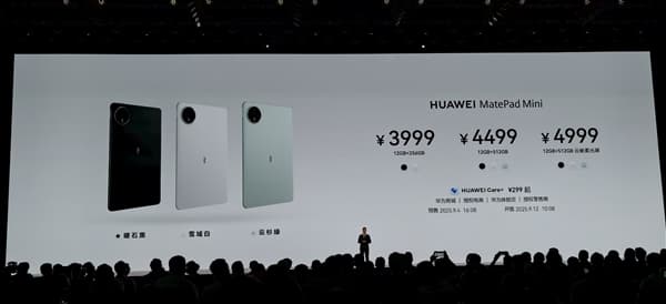 In terms of price, the Huawei MatePad Mini 12GB+256GB model is priced at 3,999 yuan, the 12GB+512GB model at 4,499 yuan, the Yunxi Soft Light Screen 12GB+512GB model at 4,999 yuan, and the Huawei MatePad Mini smart case at 199 yuan. They will go on sale at 10:08 on September 12th.