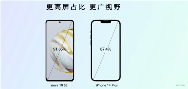 It is worth mentioning that the Huawei nova 10 SE takes up 91.85% of the screen, which is higher than the 87.4% of the iPhone 14 Plus, making the viewing more immersive.