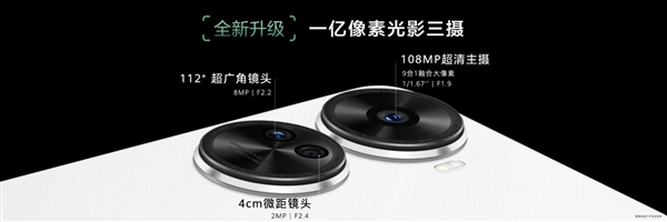The rear 100 million pixel light and shadow three-camera system is 108 million pixel main camera (F1.9 aperture, 1/1.67 outsole) +2 million pixel macro lens (4cm) +8 million pixel ultra-wide Angle lens (112°), supporting the full scene RAW domain 2.0.