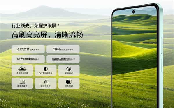 The Honor Play 70 Plus features a 6.77-inch LCD screen on the front with a resolution of 1610*720, supporting a 120Hz refresh rate, DC flicker-free dimming, eye protection mode, and natural light-like eye protection.