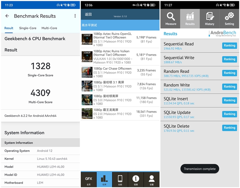 Starting with the CPU theoretical test, in GeekBench6.2.2, it outperformed the Kirin 9000 with a 3% higher single-core score of 1328 points and a 12% higher multi-core score of 4309 points.
