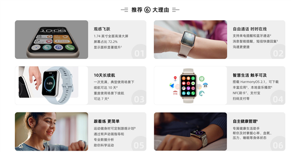 In other aspects, the battery life of Huawei Watch Fit 2 can be up to 10 days in typical use scenarios and 7 days in heavy use scenarios, which can be connected to phones running Hongmeng OS, iOS and Android systems.