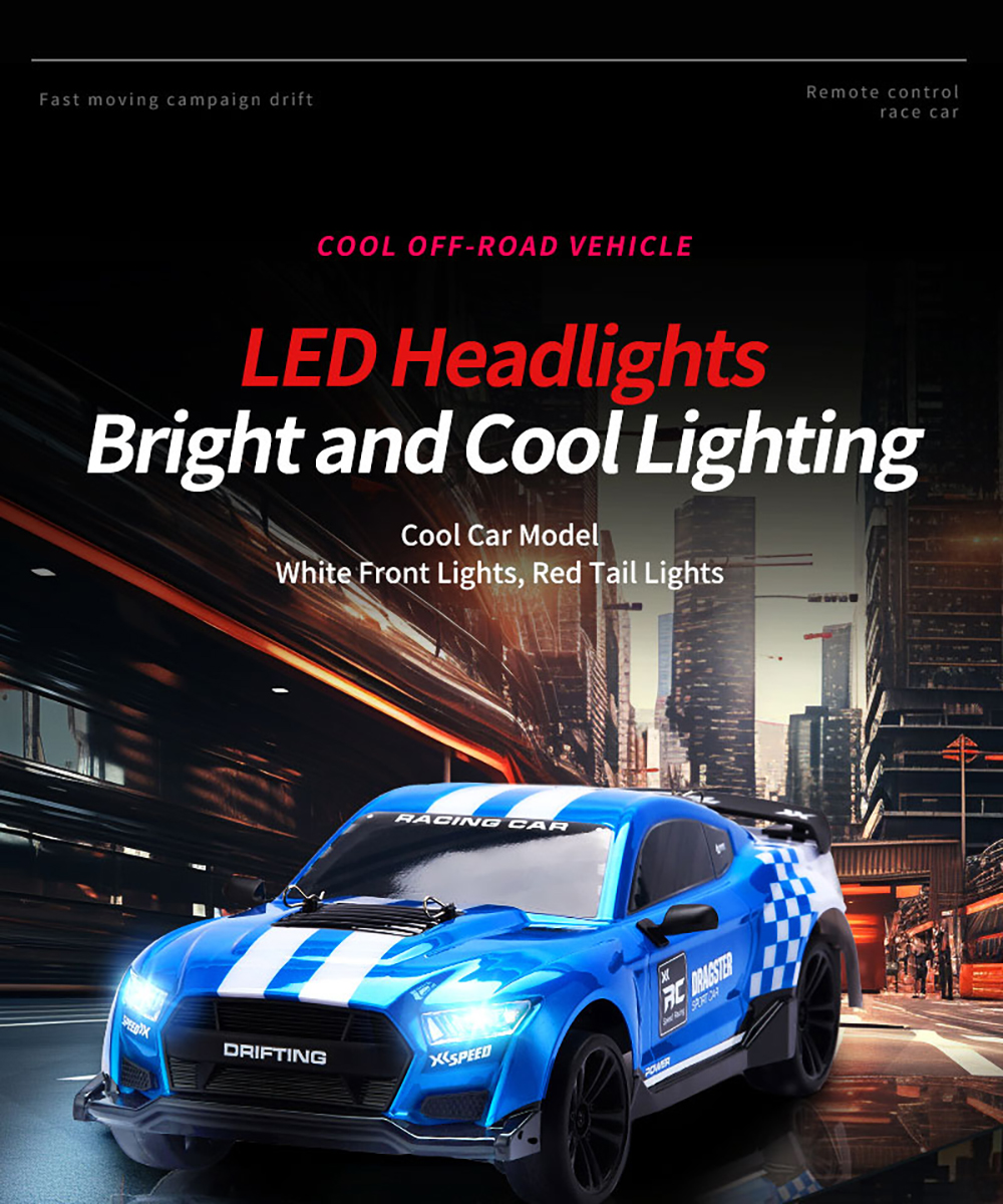 The car features LED front and rear lights, adding a touch of realism and making nighttime racing a possibility. The lights are not just for show; they provide excellent visibility, ensuring you can keep track of the car even in low-light conditions. The color options, Blue and Green, are vibrant and give the car a stylish appearance that stands out on the track.