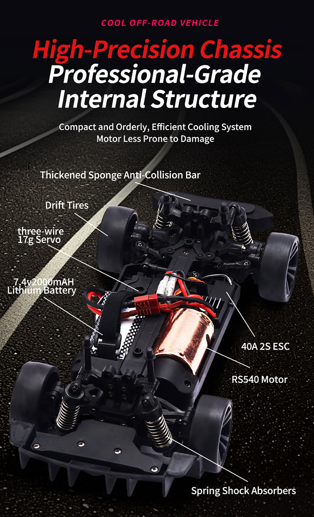 One of the standout features is the 3-wire, 17g digital servo, which offers precise control over the car’s steering, enhancing the driving experience. The 2.4GHz transmitter provides a reliable connection with a remote distance of ≥50m, allowing for extended range without losing control.