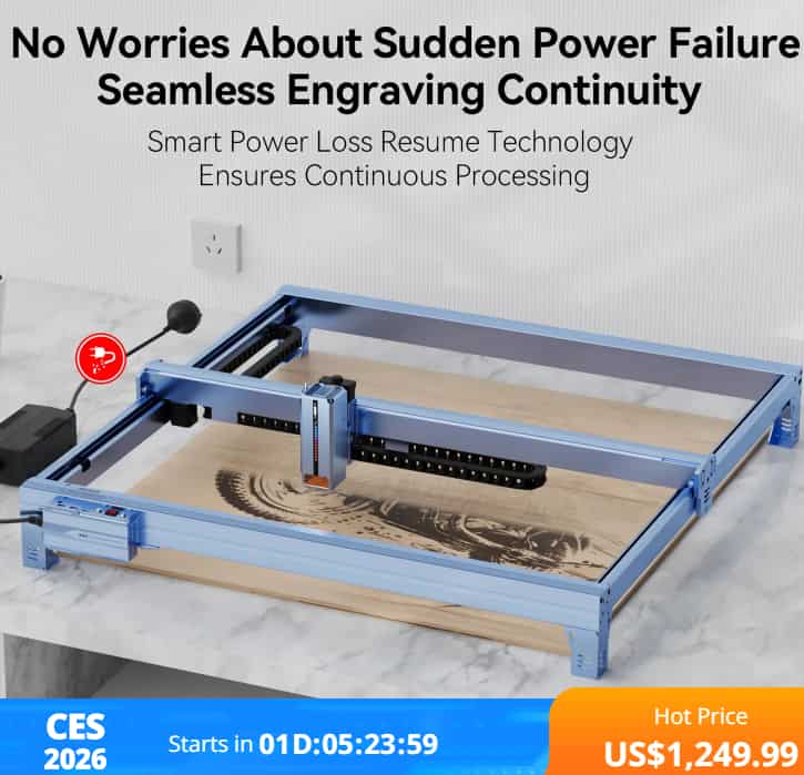 The K40 Max includes a power-loss resume feature so that if the machine shuts down unexpectedly, jobs can pick up from where they stopped — a big advantage in longer projects.