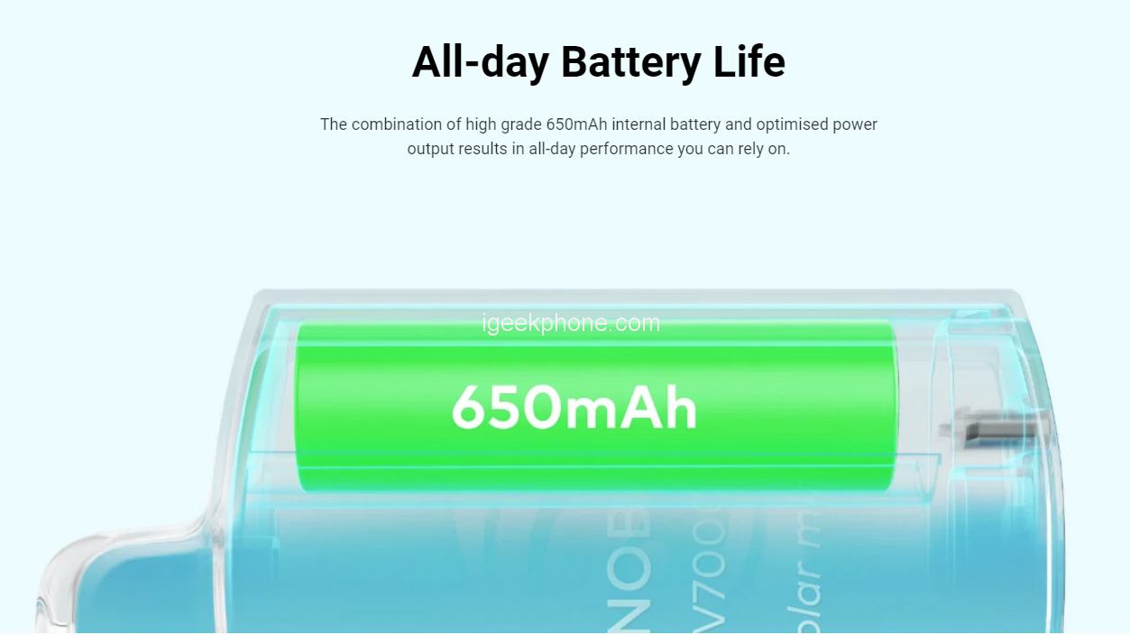 The INNOBAR V7000 has a high-grade 650mAh internal battery that offers all-day performance. This robust battery, combined with the optimized power output, ensures that vapers can rely on the device throughout the day without frequent recharging.