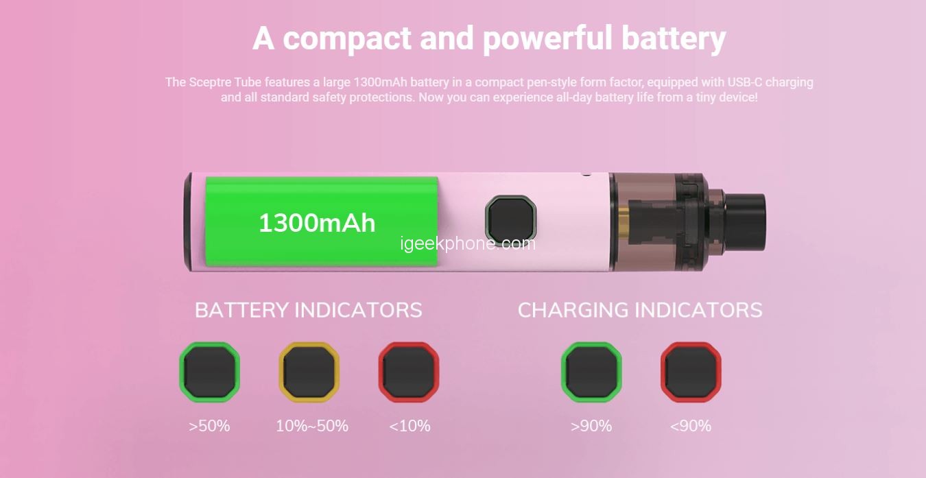 Innokin Sceptre Tube measures φ20.0*118.2. In addition, it has a larger 3ml/2ml capacity than any other vape. Additionally, the 0.6 ohm S coil is installed. Also, It has essentially more humble than the first, making it more pocket-obliging than some other times. Sceptre Tube is made with high-level zinc compound development, is lightweight, and feels premium in the hand. The 1300mah battery that comes with it ensures long-lasting performance.