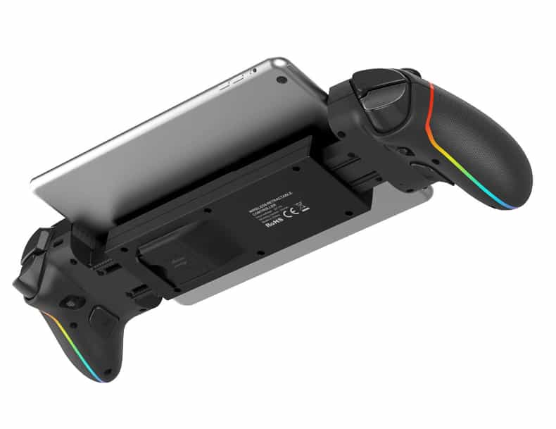 The “stretching” aspect of the PG-9122 refers to its adjustable telescopic grip, which expands to fit a range of device widths up to ~295 mm. This allows you to comfortably attach larger phones or tablets and turn them into a handheld console setup.