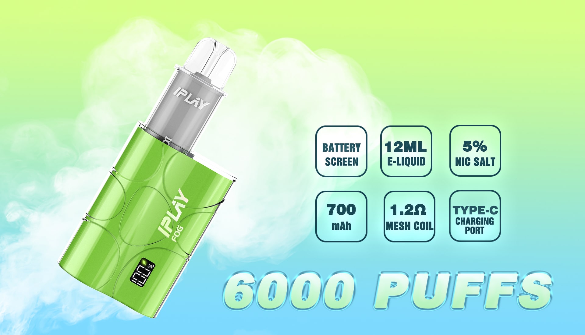 The FOG 6000 offers an unparalleled vaping journey with a generous 12ml e-liquid capacity and a 700mAh battery, ensuring long-lasting use. Its 1.2Ω mesh coil guarantees a smooth and flavorful experience with each puff. The smart battery indicator and variety of flavors cater to diverse vaping preferences.