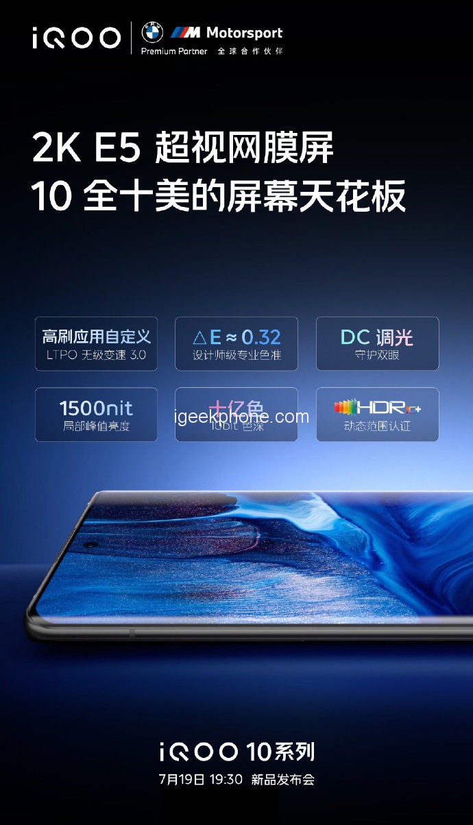 iQOO mobile phone officially announced that it will officially release the iQOO 10 series at 7:30 pm on July 19th. Beautiful screen ceiling”.