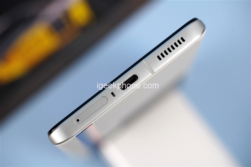 The bottom of the phone is equipped with Type-C and earphone-shared interface, speaker, microphone, and SIM card slot. The volume adjustment button and the power button are located on the right side of the phone.
