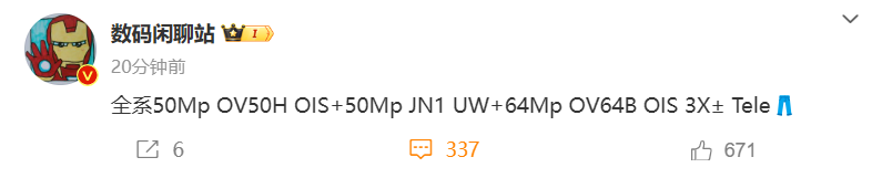 The blogger revealed that the new machine is fully equipped with 50Mp OV50H OIS main camera + 50Mp JN1 super wide-angle lens + 64Mp OV64B OIS 3X± telephoto lens, and the battery capacity is more than 5000mAh.