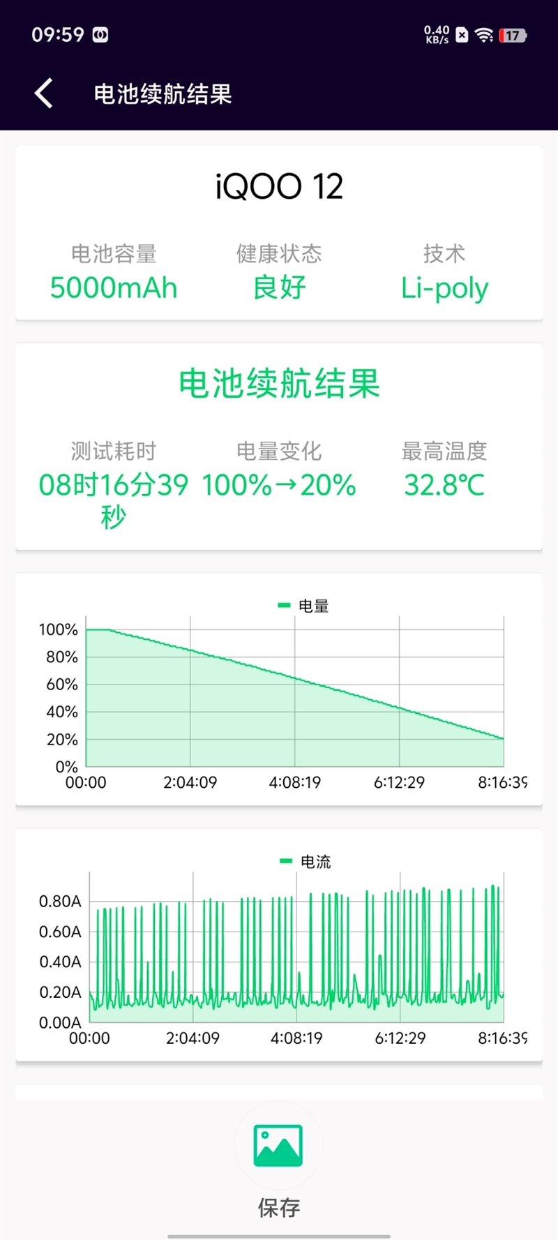 After continuous and uninterrupted testing by Battery Dog, iQOO 12’s power consumption went from 100% to 20% in 8 hours, 16 minutes, and 39 seconds. After conversion, the full battery life can reach nearly 10 hours, which is fully capable of meeting the intermittent use of daily users throughout the day.