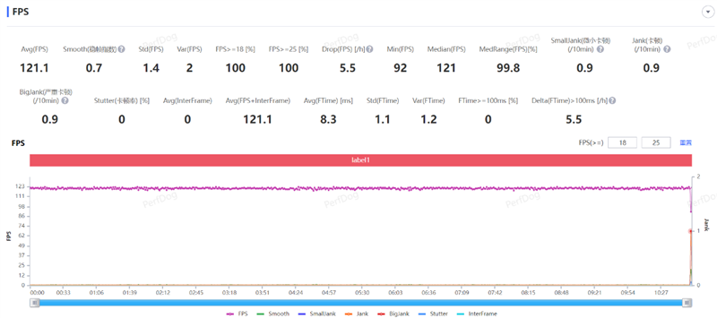 The Honor of Kings mobile game runs at native 120FPS under extreme image quality and extremely high frame rate. After a fierce battle, the average frame rate stabilized at 121.1 FPS, with an average fluctuation of only 0.7. Look at this frame rate curve stabilizing at one line. In a straight line, the game screen is smooth without fluctuations. The average power consumption has reached 3.3W, and the frame energy consumption is 27.4mW.