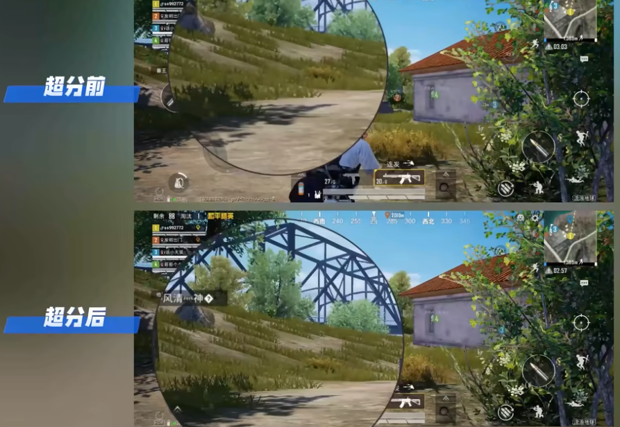 For example, in the “Peace Elite”, iQOO Neo10 Pro supports 1.5K+144fps superminute superframe concurrent, we can compare the picture before and after the superminute comparison, the details of the grass and weapons are significantly improved.