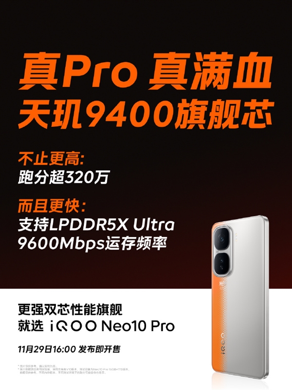 Igeekphone November 28 news, today iQOO official announced that Neo10 Pro will be equipped with LPDDR5X Ultra full blood memory, the rate can reach up to 9600Mbps.
