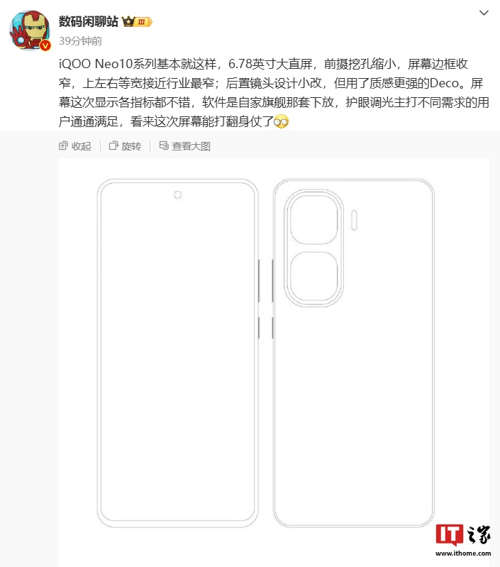 Igeekphone reported earlier today that iQOO Neo10 series mobile phone line draft has been exposed, the news said that the new machine will be equipped with 6.78 inches straight screen, front camera hole reduction, screen border narrowing; The rear lens design of the machine has been slightly modified, and the Deco with stronger texture is used.