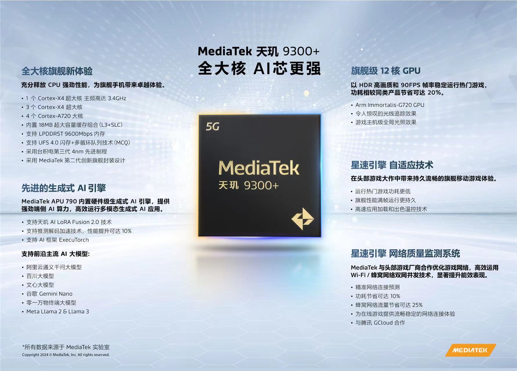 Dimensity 9300+ processor has been unveiled at today’s Mediatek Dimensity Developer Conference MDDC 2024. The processor adopts a full-core CPU architecture, with an eight-core CPU consisting of four Cortex-X4 super-cores and a maximum frequency of 3.4GHz. And four Cortex-A720 cores with a 2.0GHz primary frequency.