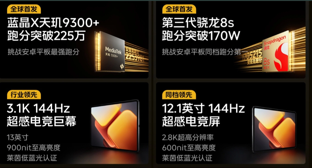 The Pad2 Pro upgrades to a 13-inch 3.1K+ 144Hz LCD with 900-nit brightness, paired with a Dimensity 9300+ chipset and a larger 11,500mAh battery capable of 14.8 hours of streaming. Enhanced features include 66W charging, Monster+ 8-speaker audio, multi-device connectivity, and USB 3.2 Gen1 support.