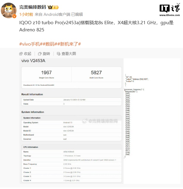 Igeekphone January 13 news, blogger @Perfect layout digital today share screenshots show that a model V2453A vivo new machine appeared on the running platform, is expected to be iQOO Z10 Turbo Pro.