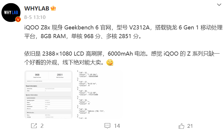 The new V2312A has appeared in Geekbench 6 scoring platform, single-core 968 points, multi-core 2851 points, powered by Snapdragon 6 Gen 1 processor, providing 8GB of RAM. According to blogger @WHYLAB, the new machine will be equipped with 2388×1080 LCD high brush screen, built-in 6000mAh large battery.