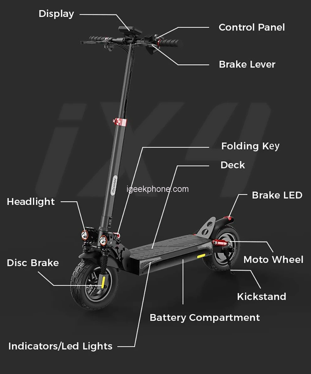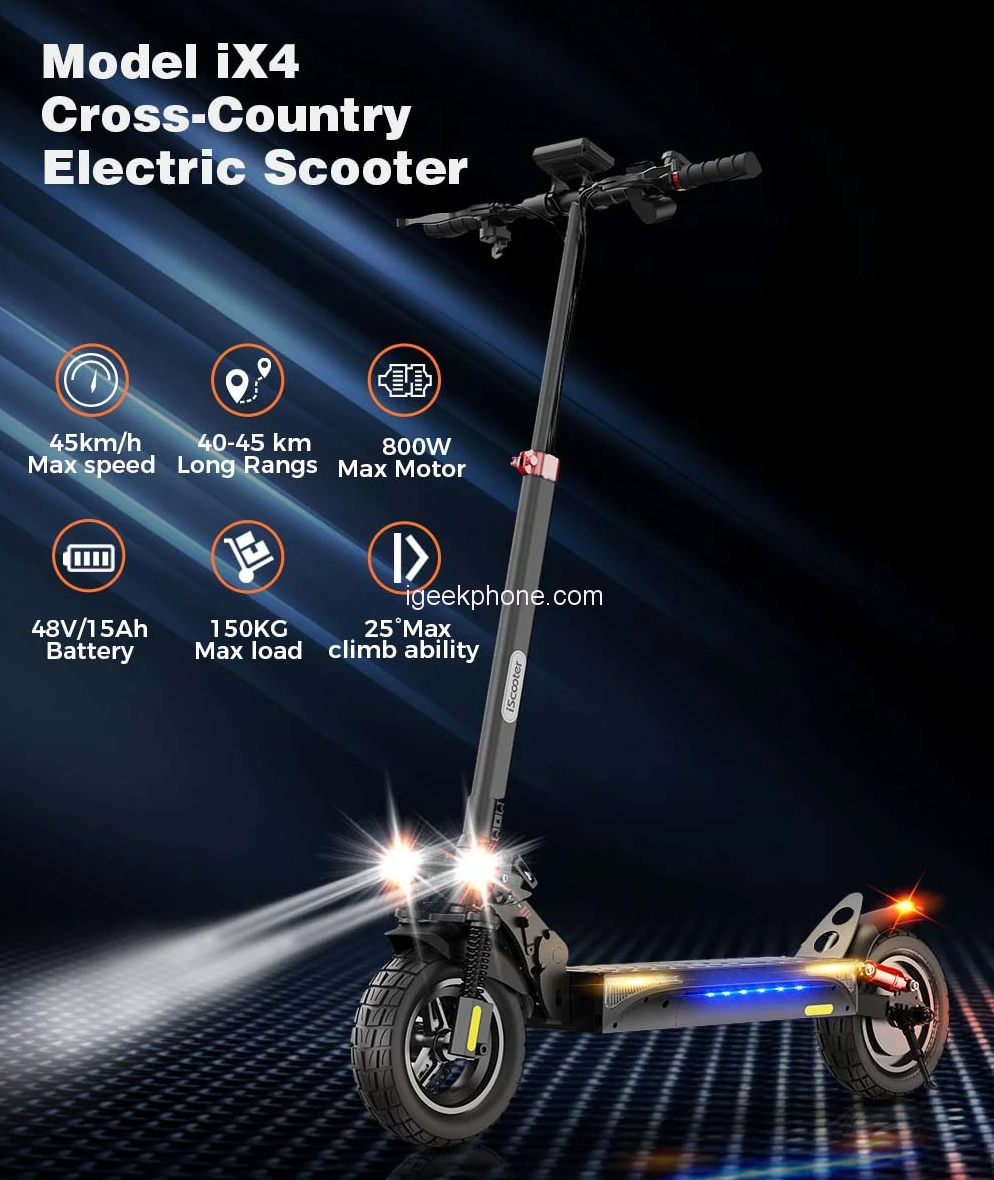 The iScooter IX4 is powered by an 800W motor, providing excellent performance and acceleration. The scooter can climb inclines of up to 25°, making it perfect for hilly terrain. The scooter also features dual disc brakes, providing excellent stopping power and a shorter braking distance.
