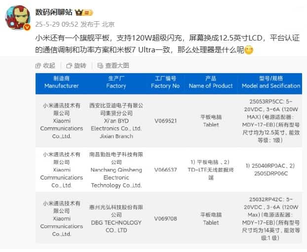 Igeekphone News, May 29th: Blogger @Digital Chat Station revealed today that Xiaomi has another flagship tablet that supports 120W Super Flash charging, with a 12.5-inch LCD screen. The communication modulation and power schemes certified by the platform are the same as those of the Mi Pad 7 Ultra.