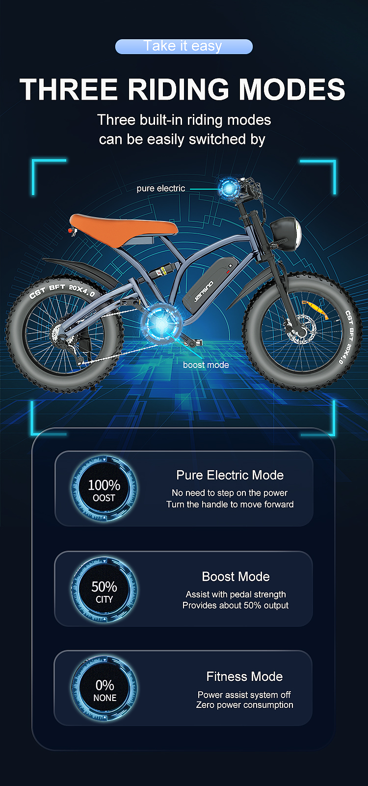 Constructed from high-carbon steel, the JANSNO X50 boasts a durable frame designed to withstand daily wear and tear. While its 37 kg net weight adds sturdiness, it may feel hefty for users frequently lifting or transporting the bike. The 20-inch rubber tires strike a balance between agility and stability, ideal for navigating city streets or light off-road trails. A spring suspension fork enhances comfort, absorbing bumps for a smoother ride.