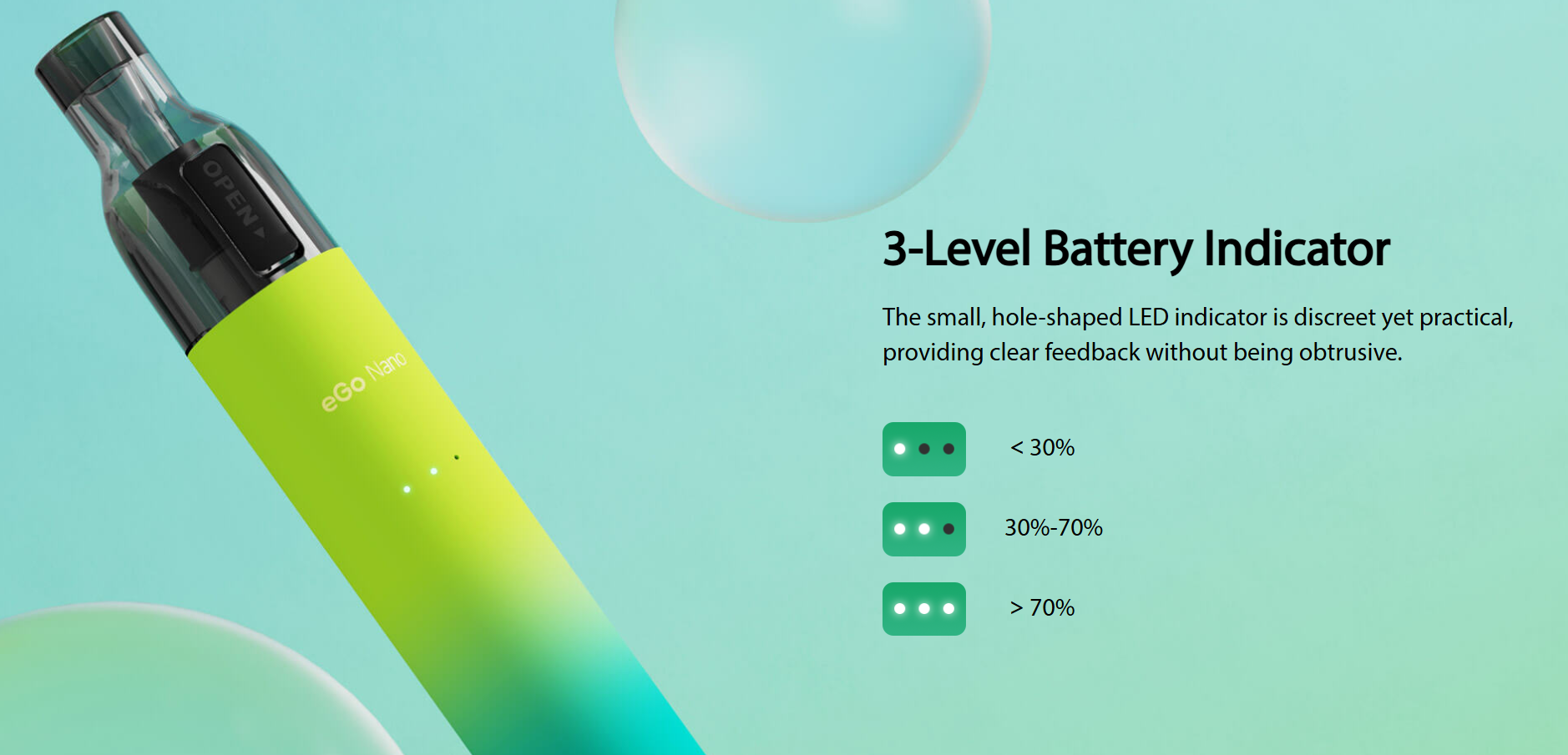 The Joyetech eGo Slim features a 360° LED ring indicator, giving you clear visual feedback on battery life—green (>70%), blue (30–70%), and red (<30%). It looks premium and feels helpful. The Nano, while more discreet with its single-hole LED, also gives battery cues in three levels, but without the same visual flair.