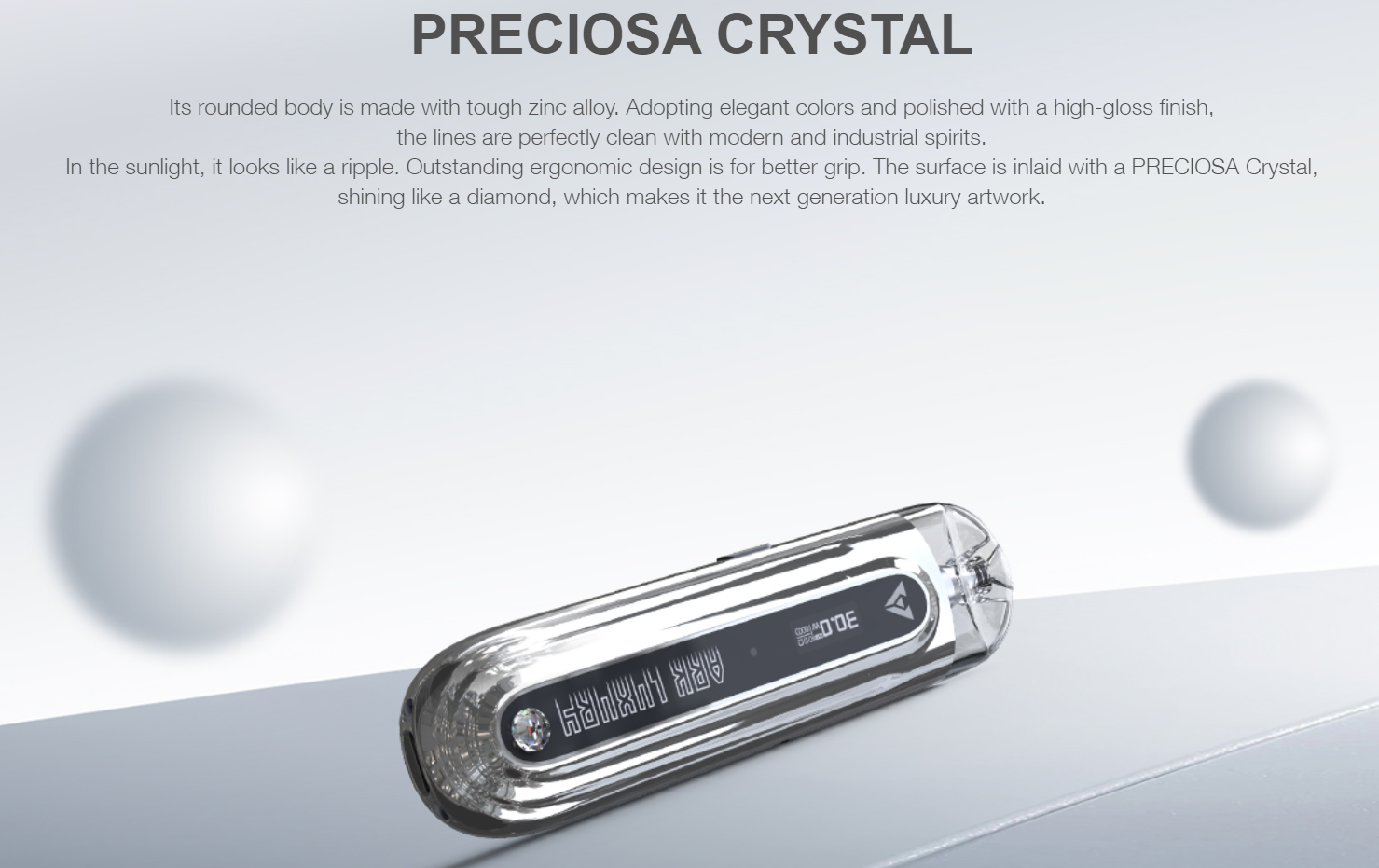 The Keystone Ark Luxury Refillable Pod is a high-end device that stands out with its luxurious design. It is a winner of the Muse Design Gold Award and the New York Product Design Awards. The device features a rounded body made from tough zinc alloy, polished with a high-gloss finish for a modern and elegant look. Its surface is inlaid with a PRECIOSA Crystal, giving it a diamond-like shine. The ergonomic design ensures a comfortable grip, and the overall aesthetic is both sophisticated and industrial.