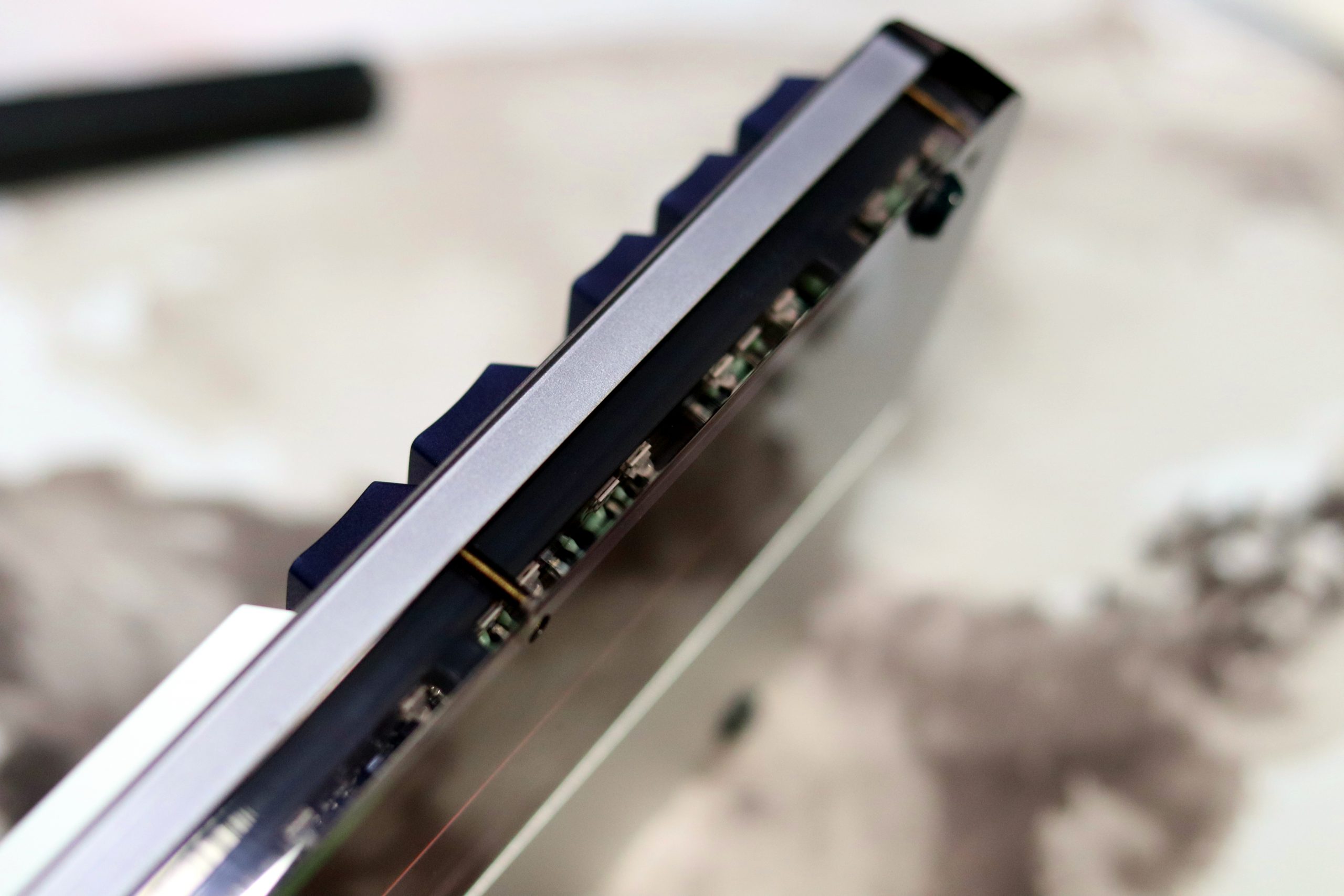 One standout feature is the CNC-machined aluminum top panel, which enhances durability and helps distribute the keyboard’s weight. The back of the keyboard houses the large, sleek battery compartment, which is cleverly designed to blend seamlessly with the rest of the keyboard’s aesthetics. Four rubber pads ensure stability, preventing unnecessary slipping during use.