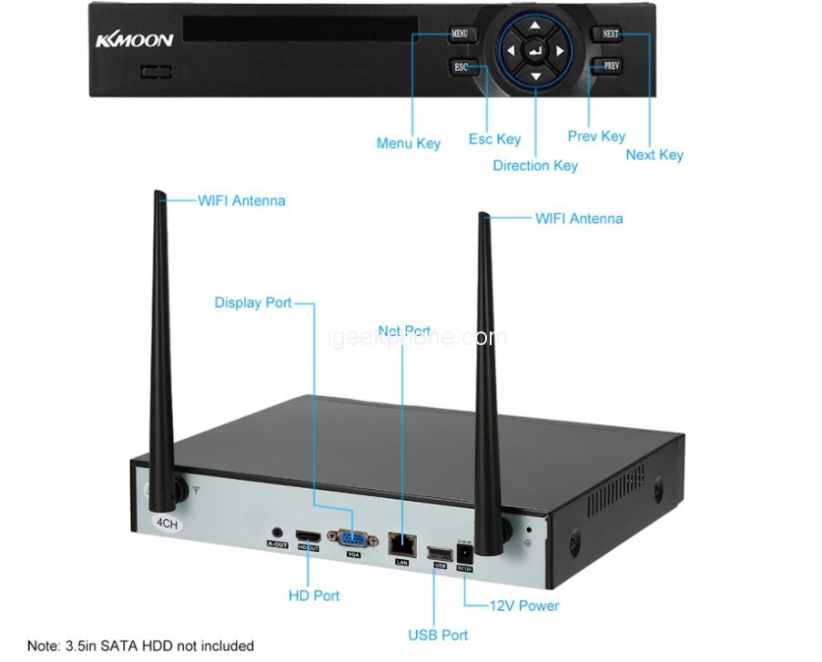 The KKmoon 4CH 1080P HD WiFi NVR Kit involves Linux as functional framework and as SoC has a Hi3520D chip. It works under PAL or NTSC signal and has a 1/4 screen for the menu. It can record at full 1080N/720P/960H/D1, involving the H.264 as video coder. It has a simple contribution of 4 x 1080N/720P/960H, an organization contribution of 8 x 1080P/720P and there is and the half and half that is 2 x 720P (simple) + 2 x 720P (IPC).