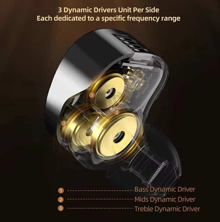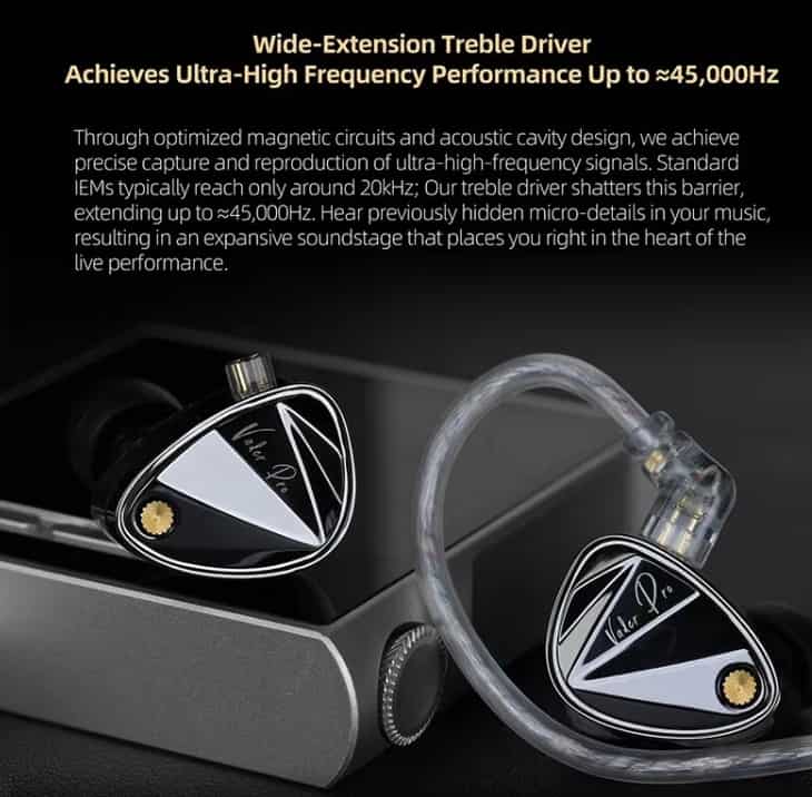 Dual Ultra-High Frequency Dynamic Drivers: A less common and intriguing choice. Dedicated dynamic drivers for the treble aim to deliver extended, airy, and potentially more natural-sounding highs compared to some BA treble implementations. This targets sparkling cymbals, clear string attacks, and overall openness without harshness or sibilance (when tuned well).