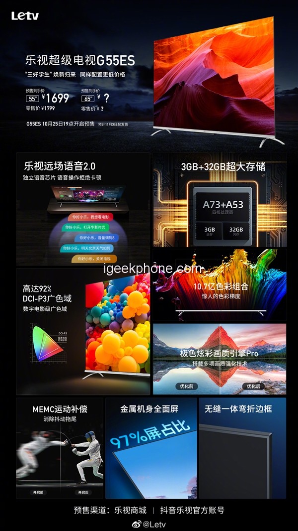 LeTV today launched the super TV G55ES, with a 55-inch 4K large screen, priced at only 1699 yuan. This TV adopts an all-metal design, a 55-inch large screen, a screen ratio of up to 97%, 3840×2160 resolution, 92% DCI-P3 wide color gamut, with 1.07 billion colors.