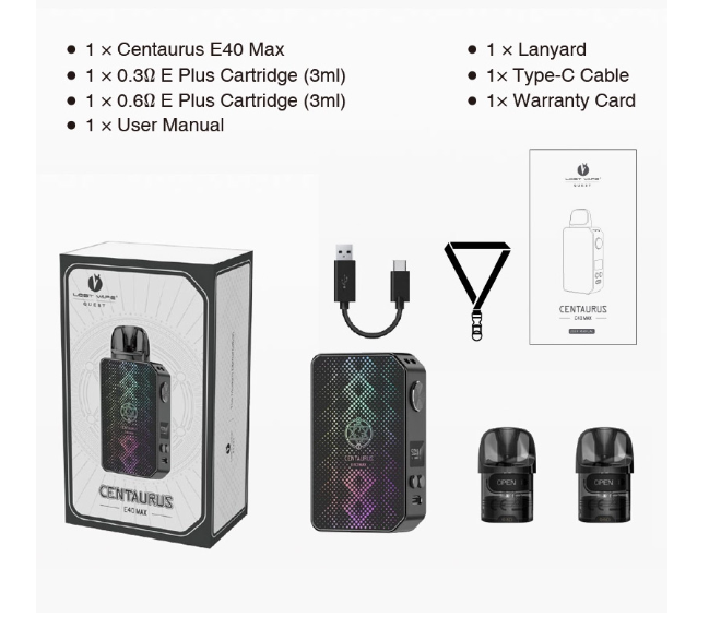The Lost Vape Centaurus E40 Max Pod Kit is a standout device that offers a perfect blend of style, performance, and ease of use in a compact and portable package. Whether you’re searching for a reliable and versatile device for daily vaping or a sleek and sophisticated option for vaping on the go, the Centaurus E40 Max Pod Kit ticks all the boxes. With its exceptional features, customizable settings, and dedication to safety, this device is guaranteed to elevate your vaping experience to new heights.